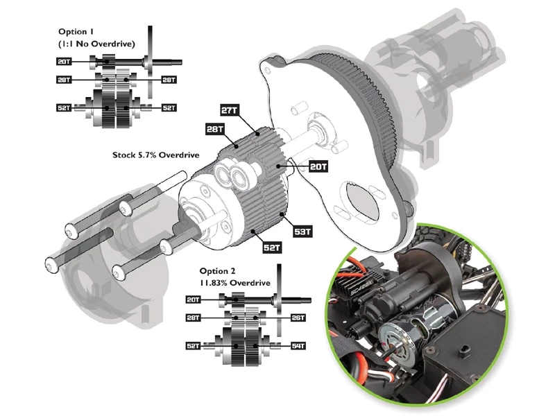 Stealth(R) X transmission: At thecenter of the Knightrunner 4X4 chassis is Associated Electrics’ revolutionary Stealth(R) X transmission. What makes this transmission different from others is the ability to adjust the front and rear drive ratios independently across three different levels. Out of the box, the Stealth(R) X comes pre-installed with the 5.7% overdrive gears. As an added bonus, the 11.83% overdrive gears are included, but not installed. Available separately are a one-to-one ratio option for those who wish to drive the front and rear equally.